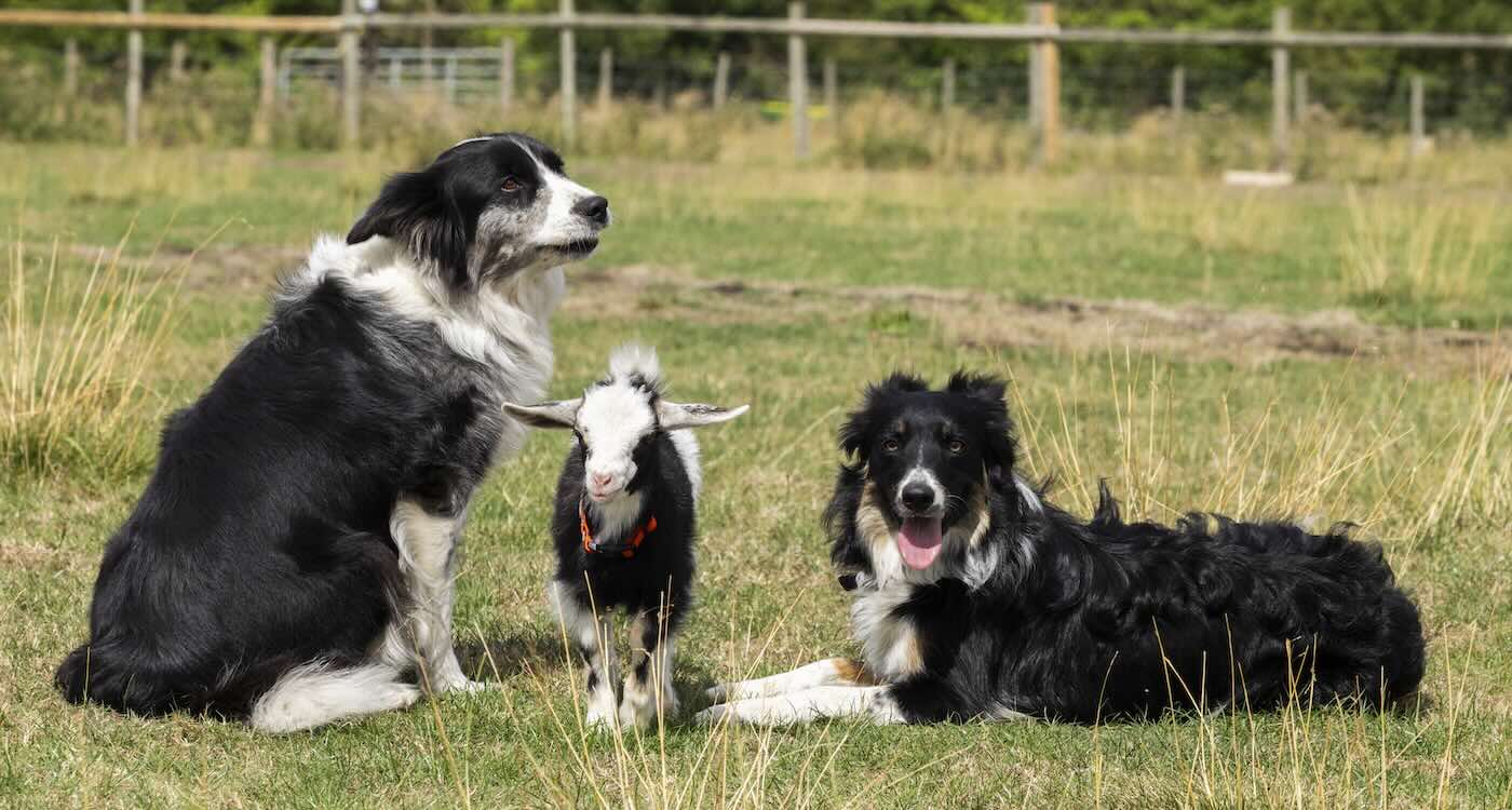 A tiny goat triplet shunned at birth is thriving after she was taken in by two sheepdogs.