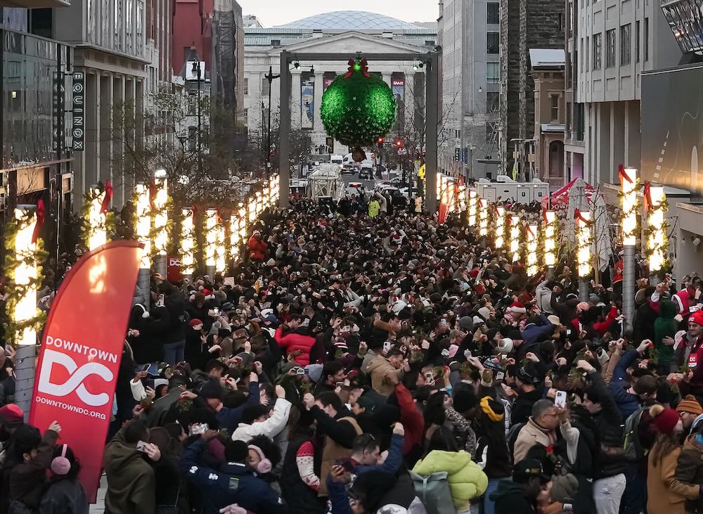 Suspended 30-feet in the air, a Christmas beacon hangs in Washington, DC—a 10-foot bundle of greenery and ribbons that locals are calling the National Mistletoe.