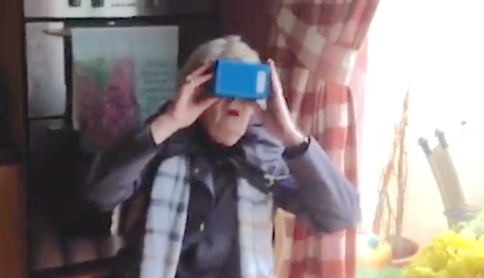 Much like how passing drivers cannot seem to look away from automobile wrecks, this granny could not stop looking at the virtual theme park, even while resolving to put the device down.