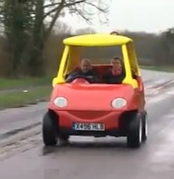 John Bitmead constructed an adult-sized copy of a Little Tikes toy car. The registered vehicle runs on gasoline and can reach speeds of up to 70mph (110km/h).