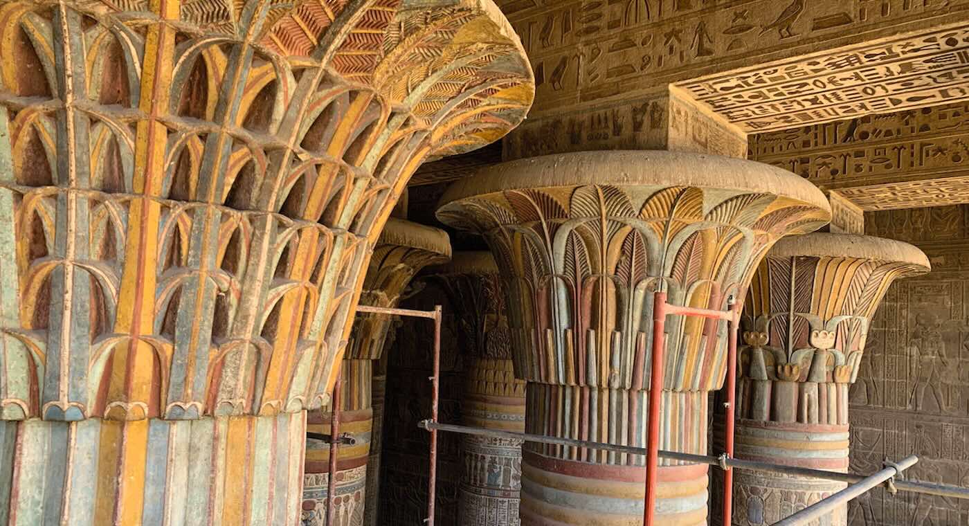 Located far in the south, confusingly called “Upper Egypt” on the west bank of the Nile, the Temple of Khnum has survived since the time of Cleopatra. Recently undergoing extensive restoration work, colors, painted inscriptions, and beautiful carvings cover every inch of the structure.