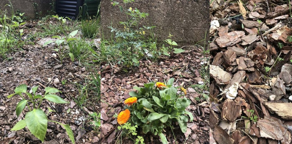 In the left frame one can see a line of yellow bell peppers, and on the right, the sown carrots beginning to emerge from their thick winter mulch. The flowers in the middle are calendula, which I also started early to build as deep a root system as possible to survive the summer.