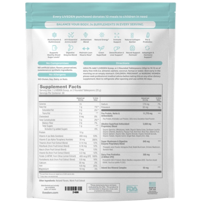 - Giving Back: Every LIVEDEN BALANCE purchase provides 10 meals to children in need.