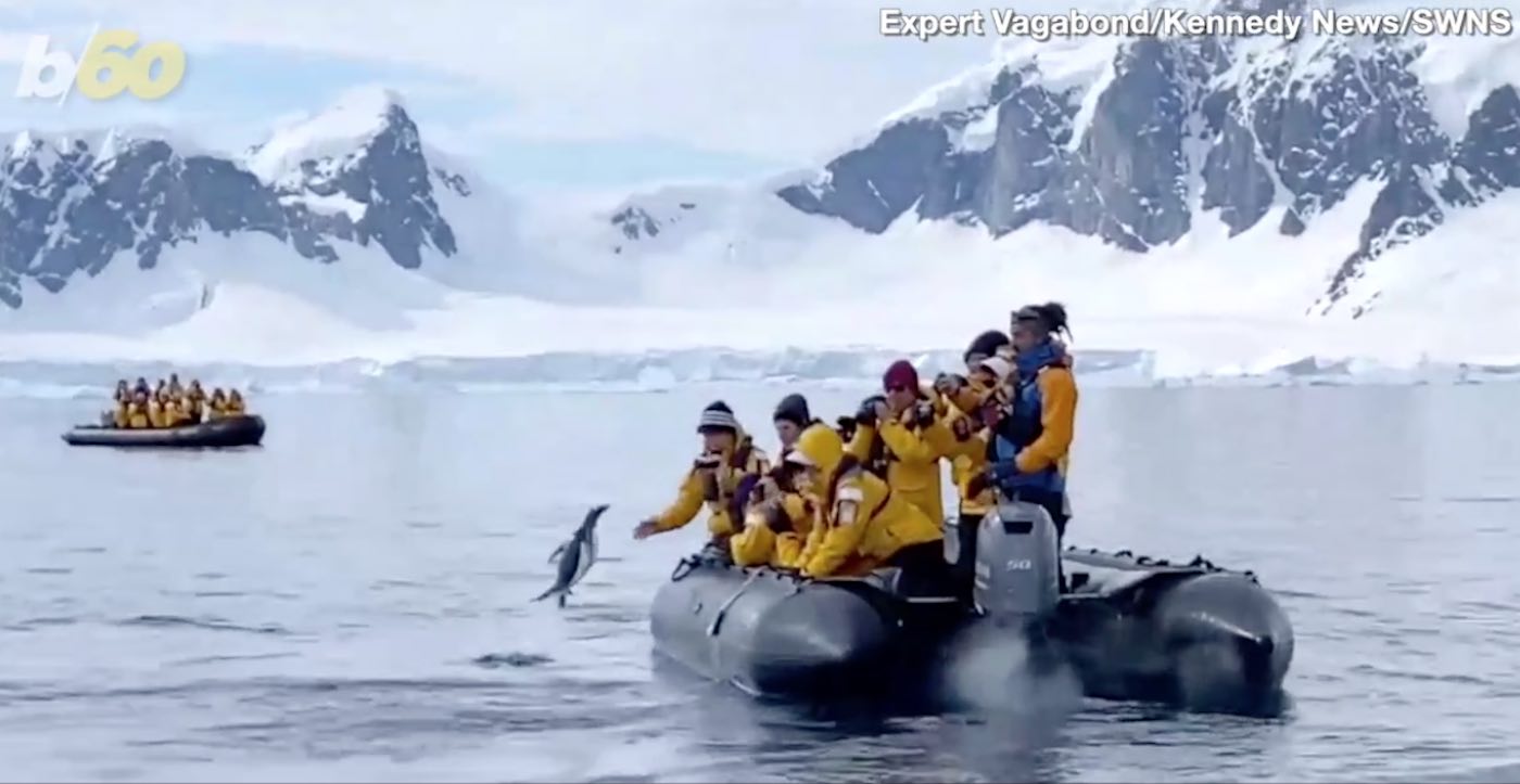 Un pingüino papúa que estaba siendo perseguido por una manada de orcas dio un salto desesperado en busca de seguridad a su bote.