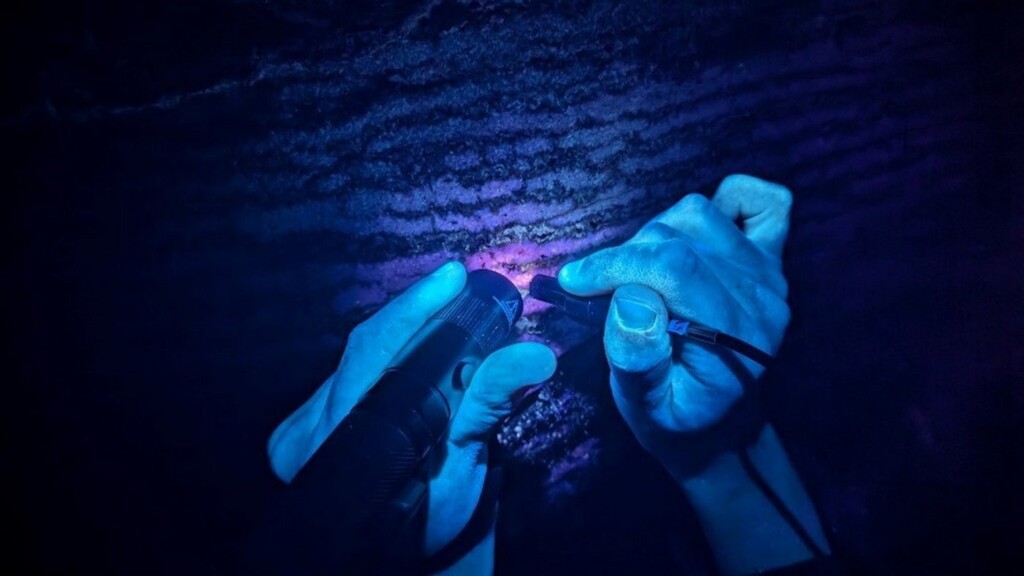 “But then, when we turned on the black lights, what used to be just a plain brown wall turned into a bright layer of fluorescent mineral that indicated where a pool of water used to be 10,000 or 20,000 years ago.”